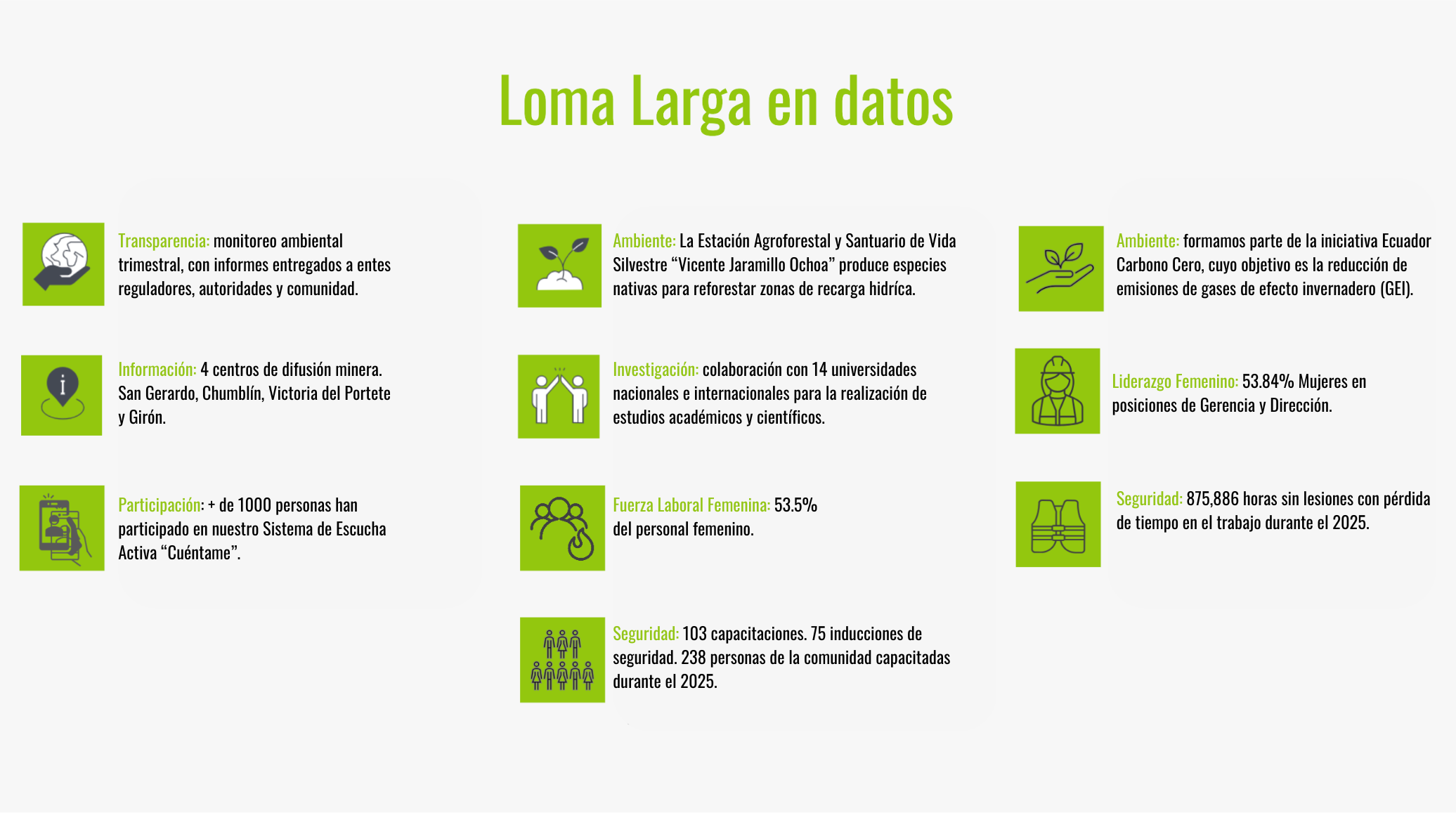 Desde 2021, se ha implementado en Ecuador un sólido programa de Responsabilidad Social Corporativa (RSC), en colaboración con los gobiernos parroquiales (GAD) para promover el desarrollo comunitario en áreas como salud, infraestructura, cultura, educación y producción. Además, el 100% de la comunidad en el área de influencia social directa ha sido informada sobre el desarrollo del Proyecto Minero Loma Larga.