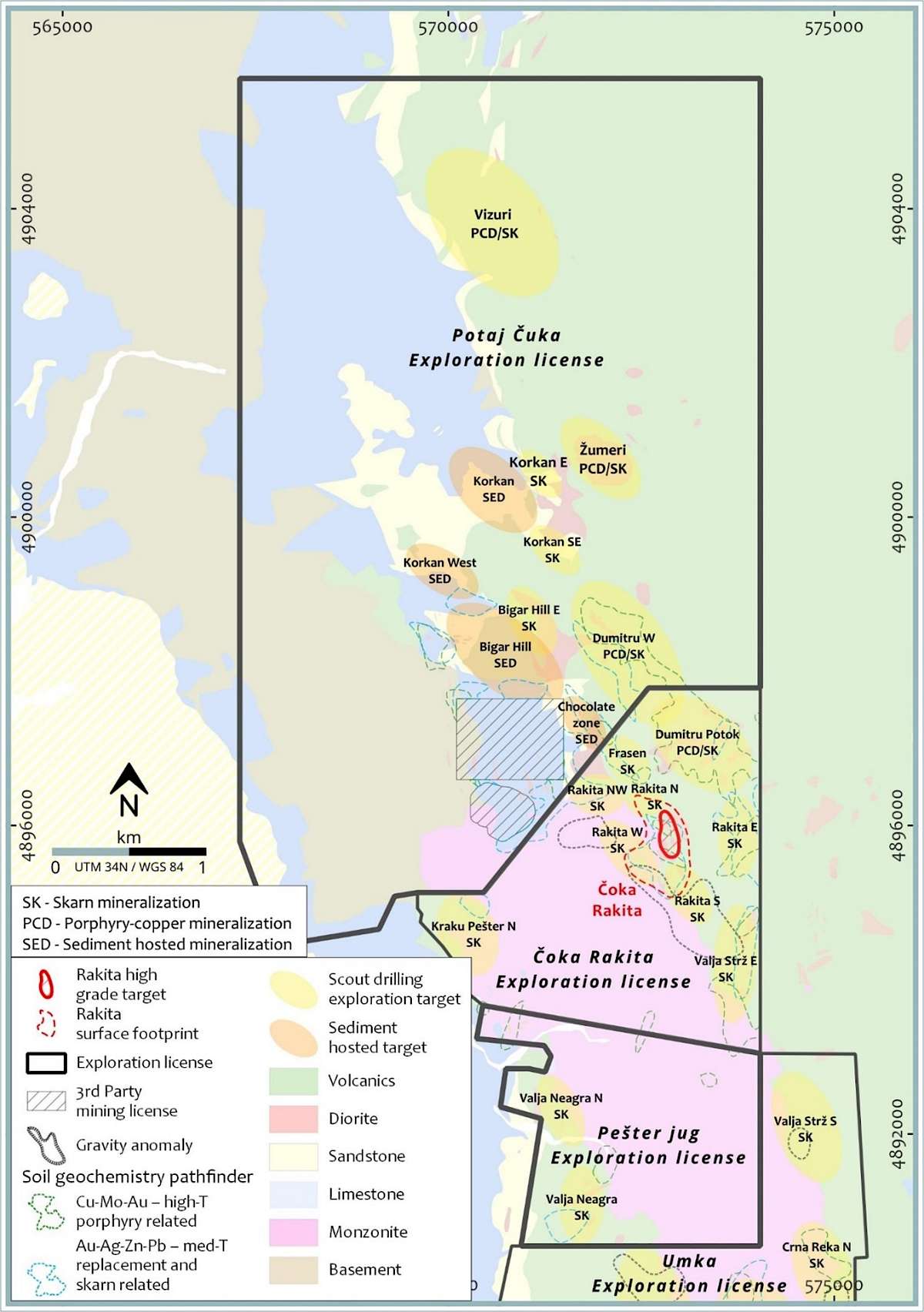Figure 4. Overview map of tenements and regional targets around Čoka Rakita.