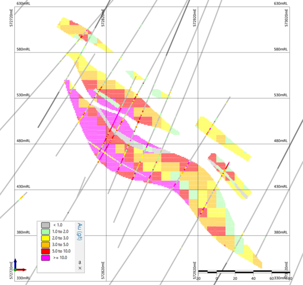 Vrednost graničnog sadržaja od 2 g/t Au i minimalno ograničenje širine od 5 m x 5 m x 2,5 m je korišćeno kako bi se definisali optimizovani prostori za iskopavanje (,,MSO’’ – Datamine’s Meneable Shape Optimizer). Ovi prostori su naknadno izravnjavani i korišćeni za okonturivanje kontinuiranih zona mineralizacije za konačno izveštavanje o mineralnim resursima.