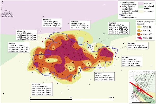 Rezultati programa pogušćenja mreže bušenja ukazali su na brojne, široke preseke sa visokim sadržajima zlata koji potvrđuju kontinuitet mineralizacije zlata u zoni bogatog jezgra unutar kontura mineralnih resursa (videti Sliku 1). Ovo je posebno evidentno u bušotinama RIDD054A, RIDD055, RIDD057 i RIDD078, koje su ukazale na intervale unutar zone bogatog jezgra koji dobro korelišu sa susednim bušotinama.